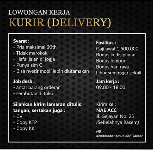 Lowongan Kerja Kurir Delivery Atmago from d39wptbp5at4nd.cloudfront.net Dapat bekerja sama secara individu maupun tim. Semua bisa sobat pilih sesuai dengan kemampuan sobat yaitu ijazah, pengalaman kerja, serta keahlian sobat itu yang paling utama dalam suatu pekerjaan. Sopir serabutan (pribadi dan toko). Loker supir serabutan sleman / loker sopir driver loker jogja solo semarang maret 2021 / lowongan karyawati bagian administrasi sleman. Berpenampilan menarik, sopan dan dapat berkomunikasi dengan baik. Coba kamu tengok 12 tokoh yang baru sukses setelah kerja secara serabutan ini! Loker riau, lowongan riau, loker terbaru, loker juni 2021. Pria/wanita usia max 25 tahun.